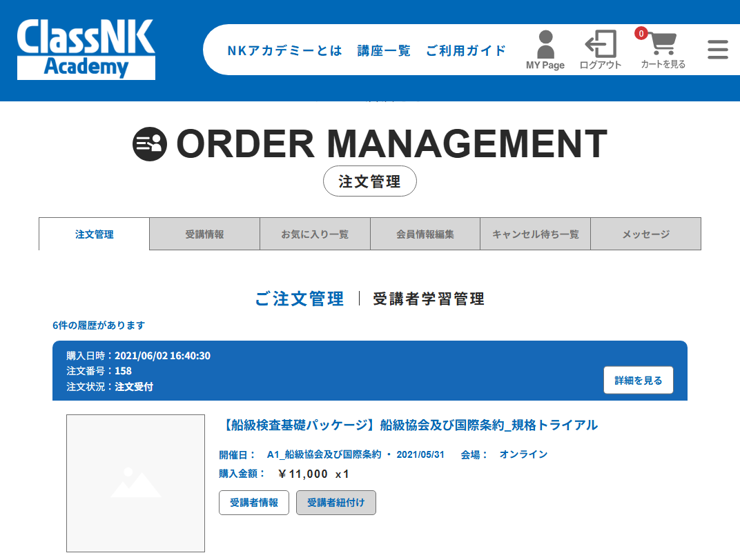 ①入金完了メールの受信後、申込者のマイページ>注文管理>ご注文管理より、該当商品の「受講者紐づけ」をクリック