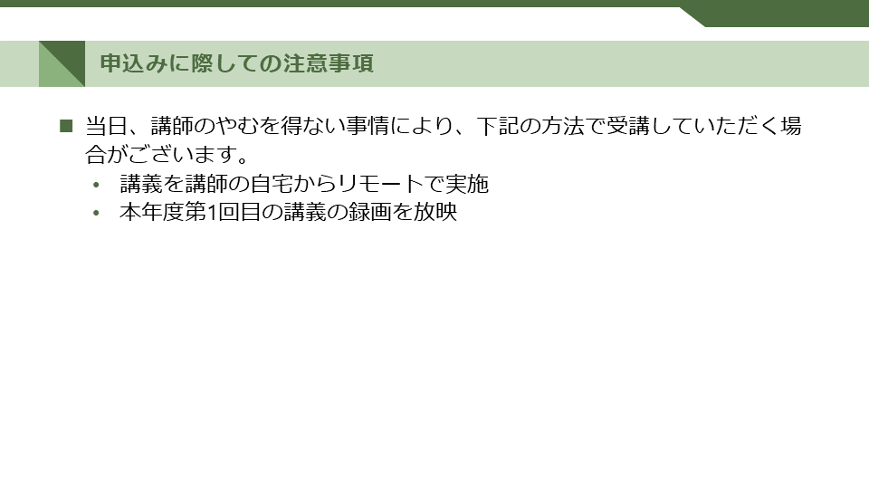 3. 当日、講師のやむを得ない事情により、下記の方法で受講していただく場合がございます。