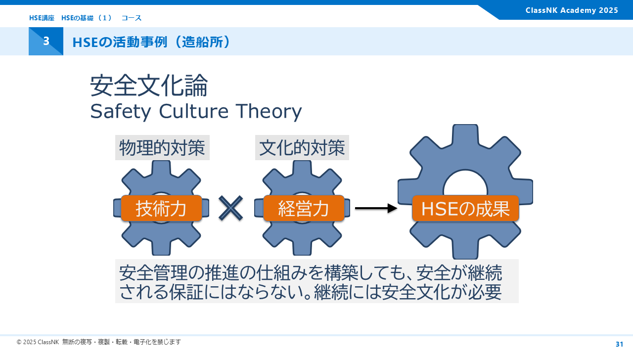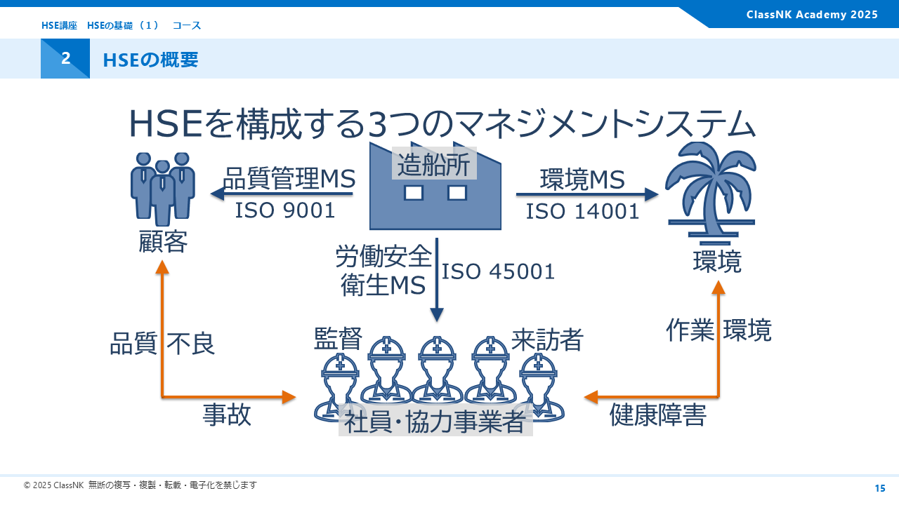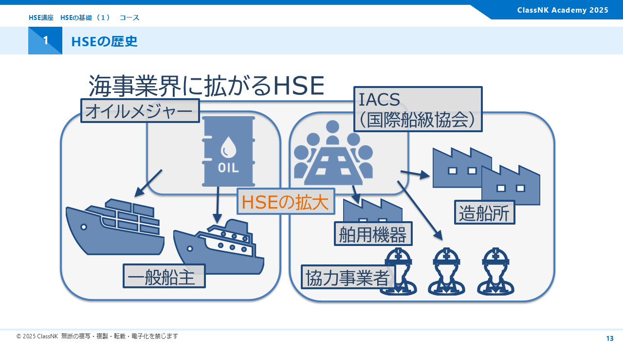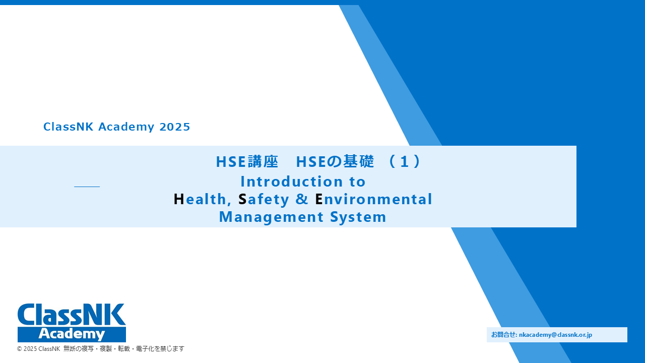 こうした背景を踏まえ、本講座ではHSE成立の歴史と概要、造船所における取組を紹介します。マネジメントの全体像、造船所での実践事例等、現場に直結する知識習得のための入門教材としてご活用頂けます。