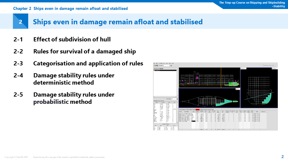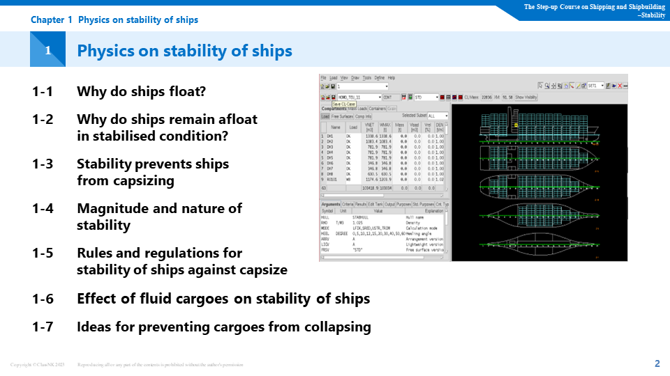 Once a maritime accident occurs, it not only leads to the loss of lives and properties but also inflicts significant damage upon the marine environment. In order to prevent such maritime accidents and minimize the resulting damages, regulations concerning stability are applied to newly constructed vessels. In this E-Learning course that we offer, aimed primarily at individuals involved in ship planning, design, or operation, we comprehensively explain fundamental knowledge about the stability of ships. This includes the principles of buoyancy and stability at work in ships, as well as the content of rules pertaining to stability in both undamaged and damaged scenarios. The course content will be conveyed through videos, animations, and other user-friendly mediums, making it easily understandable.