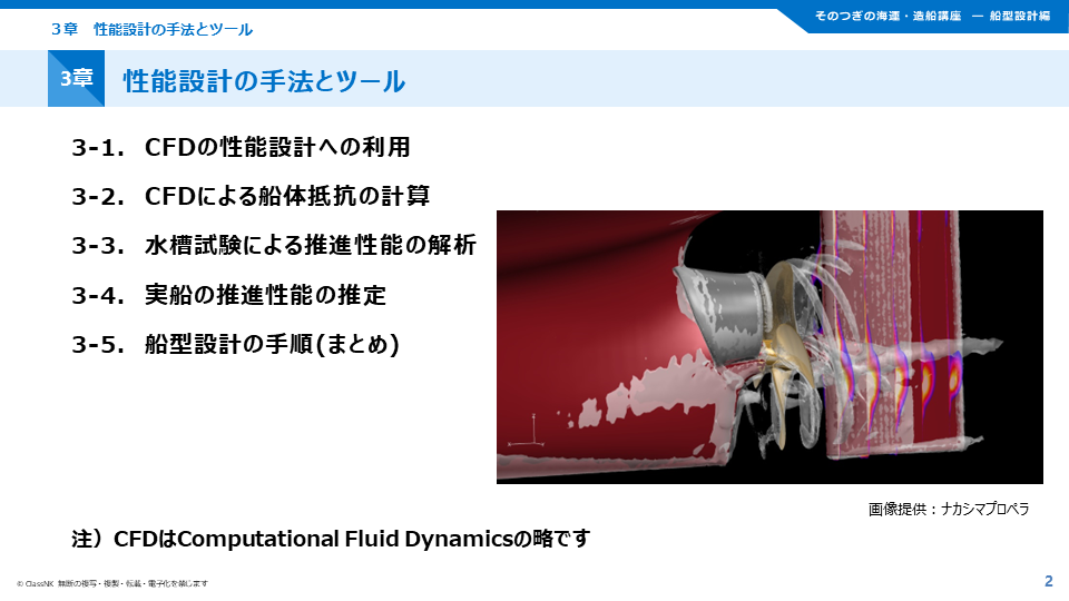 海事産業では、GHG排出削減が緊急の課題として大きな注目を集めています。そのためのキーテクノロジーの一つが船の推進性能向上技術ですが、非常に専門性が高く理解が難しい技術でもあります。今回ご提供いたしますE-Learning講座では、造船技術者のみならず、船舶の性能に関する知識を必要とする方を対象に、プロペラの原理から船型や省エネ付加物の性能に及ぼす影響に至るまで、船型設計に関する幅広い知識を、水槽試験やCFD(数値流体力学)の動画などを使って分かりやすく解説いたします。
