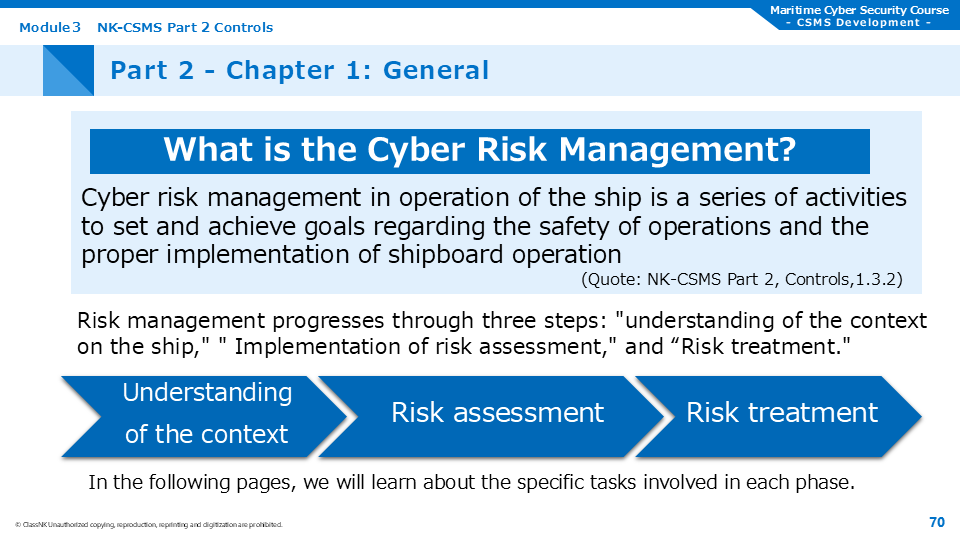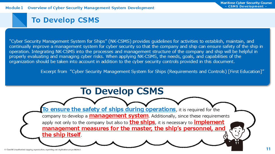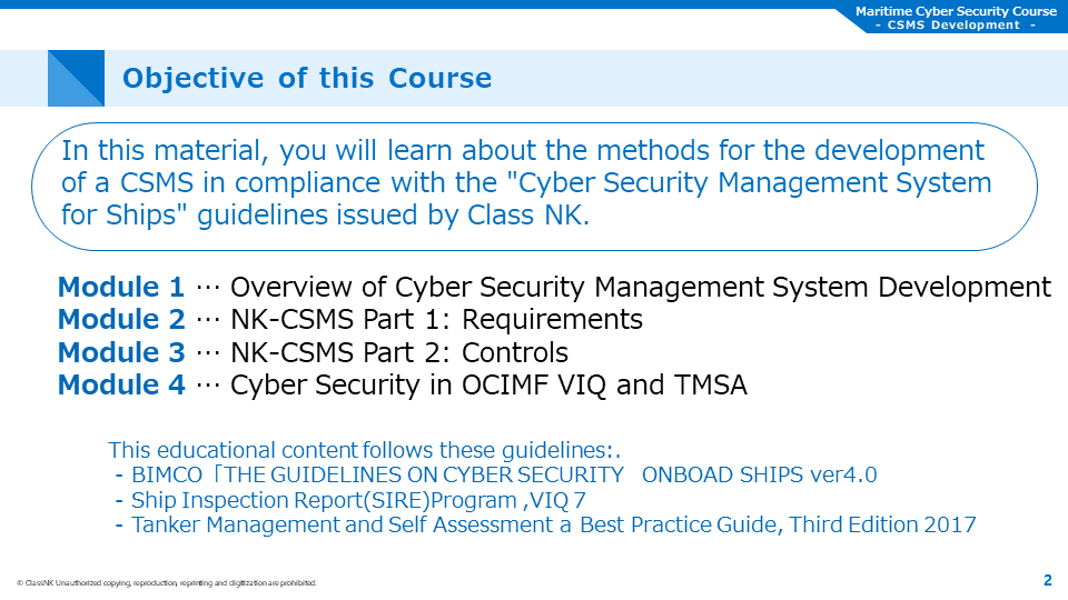 This course covers the cyber security management system developed by ship management companies, based on the guideline "Cyber Security Management System for Ships" published by ClassNK.
