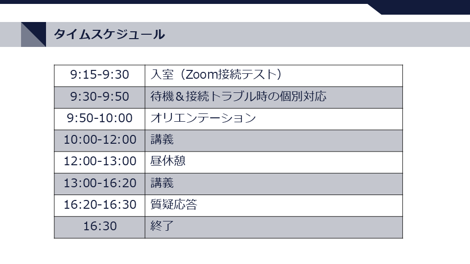 2. 当日は出欠確認のため、終日ビデオをオンにして受講いただきます。また、講義中の質疑応答や接続トラブル時等の対応時にマイクをご使用いただく場合がございます。ご使用のPCにカメラ・マイクが内蔵されていない場合には、外付けWebカメラ・マイクのご準備をお願いいたします。
