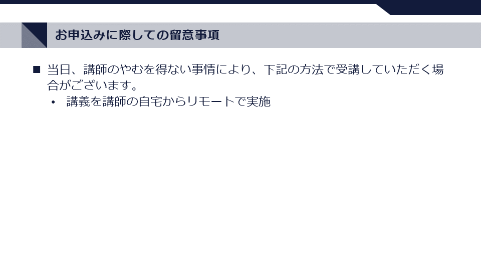 3. 当日、講師のやむを得ない事情により、下記の方法で受講していただく場合がございます。