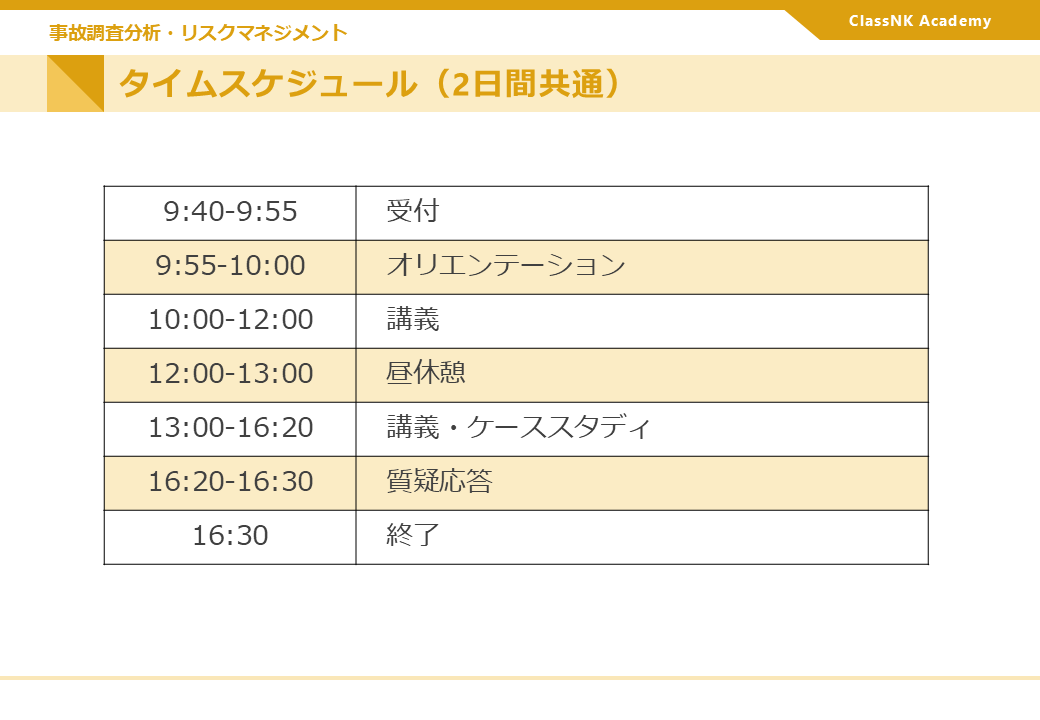本コースでは講義に加え、 1日目は実際の事故を想定したケーススタディを行い、 船舶の所有者や管理会社が行う船舶の運行に係る事故 ・ ニアミスの調査分析の手順及び手法の理解を、 2日目は各々の現場で発生し得るリスクを想定したケーススタディを行い、 海上における人命 ・ 財産の安全及び環境保護に関するリスクマネジメントについて理解を深めていただけます。