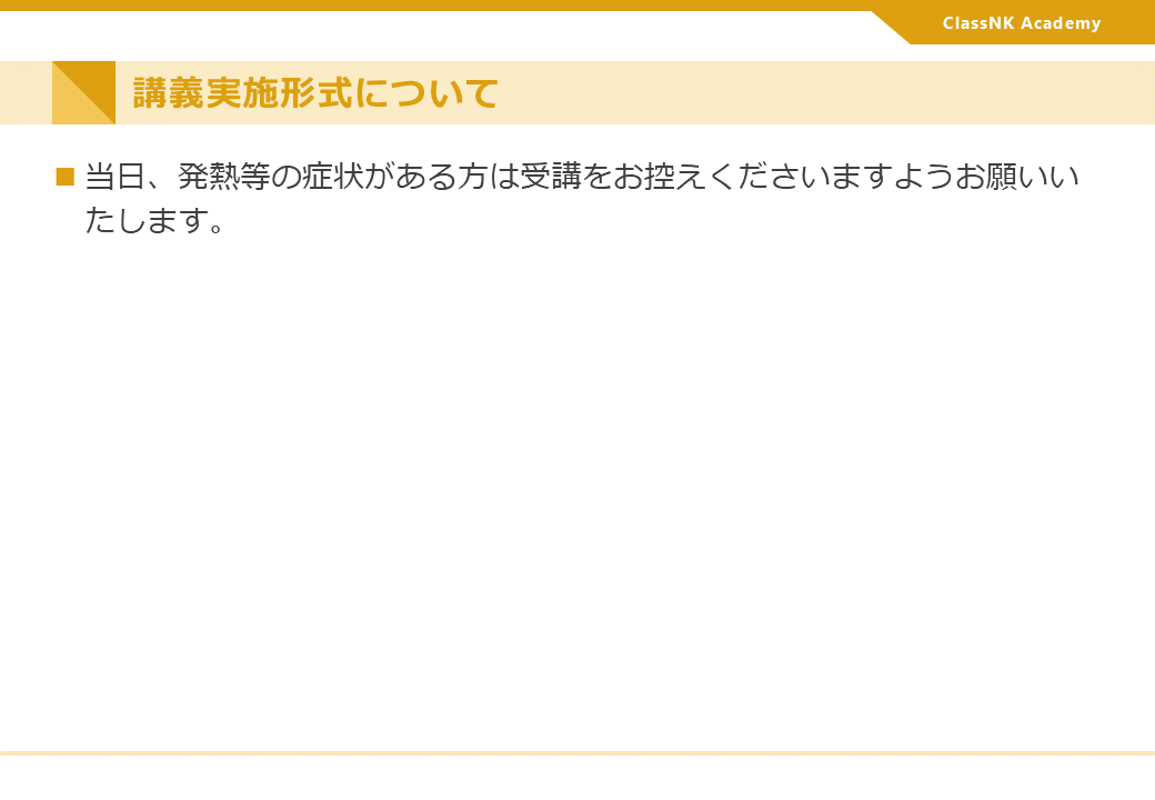 講義当日は、資料の閲覧及びケーススタディへのご参加のため、ご受講者様はPCをご持参いただけますようお願いいたします。ご持参いただけない場合は、事前に事務局(Tel: 03-5226-2188, E-mail: nkacademy@classnk.or.jp)までご相談の上、お申込みいただけますようお願いいたします。